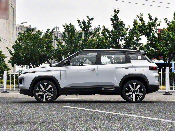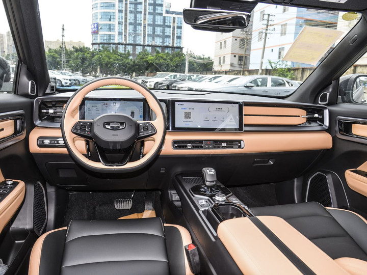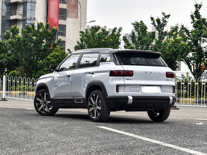 再来看车身侧面部分,车身侧面是吉利 ICON 的标志性所在,“方盒子” 轮廓勾勒出硬朗线条,巧克力系列的悬浮式车顶与隐藏式门把手,将风阻系数降低,兼具美感与能效。牛仔系列则通过宽体轮眉、潮酷型格大包围与 17 英寸越野轮毂的组合,强化轻越野姿态,部分版本还配备红色卡钳与 AT 越野胎,抓地力与视觉冲击力双重提升。车身尺寸方面,巧克力系列为 4350×1815×1620mm,牛仔系列略大至 4442×1860×1770mm,均保证了充裕的内部空间。